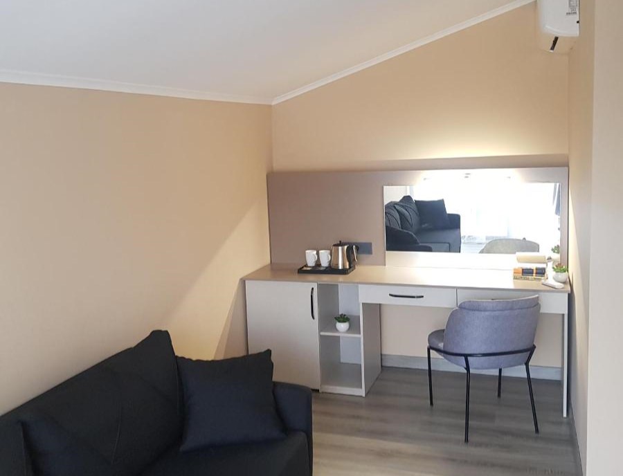 Площадь номера - 33 кв.м. 4 осн. места. Мебель: вешалка, диван раскладной, зеркало, кровать двуспальная, прикроватные тумбочки, стол, стул, шкаф. Оборудование: кондиционер, мини-холодильник, сейф, телевизор, чайная станция. Санузел: с душевой кабиной, тапочки, туалетные принадлежности, фен, халат. Сервис: Wi-Fi бесплатно, смена полотенец, смена постельного белья, уборка номера.
